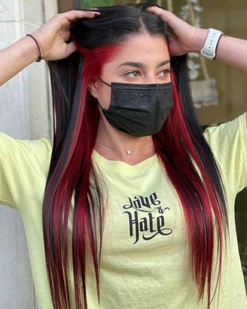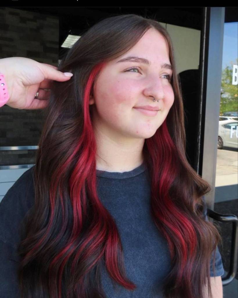 If you’re not ready to fully commit to red highlights, peekaboo red highlights offer a playful alternative. This involves adding red streaks underneath the top layer of hair, so they only show when your hair is styled a certain way or caught in the wind.