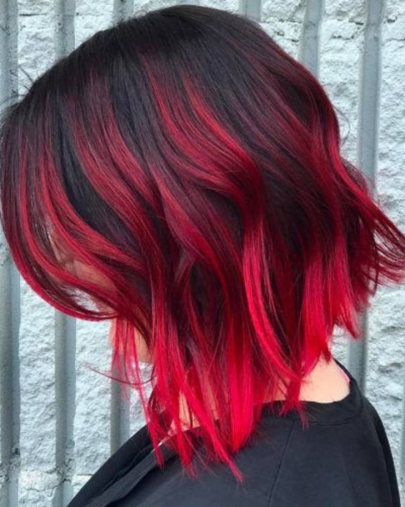 Scarlet balayage adds a pop of bright red to black hair in a blended, natural way. The hand-painted technique ensures that the highlights are perfectly placed for a sun-kissed look, making this a more low-maintenance option for red highlights.