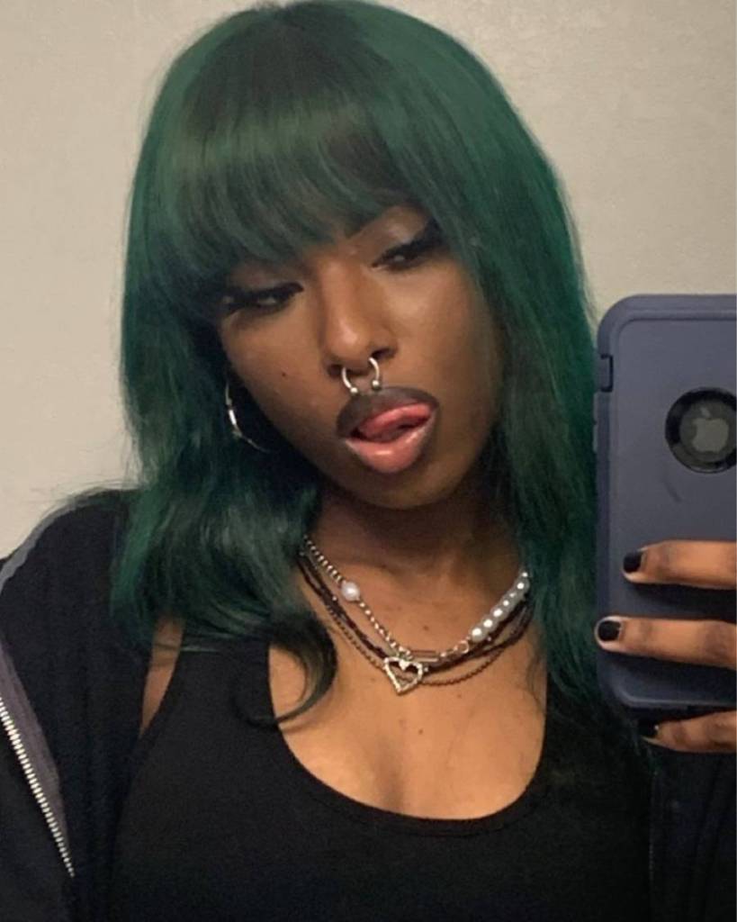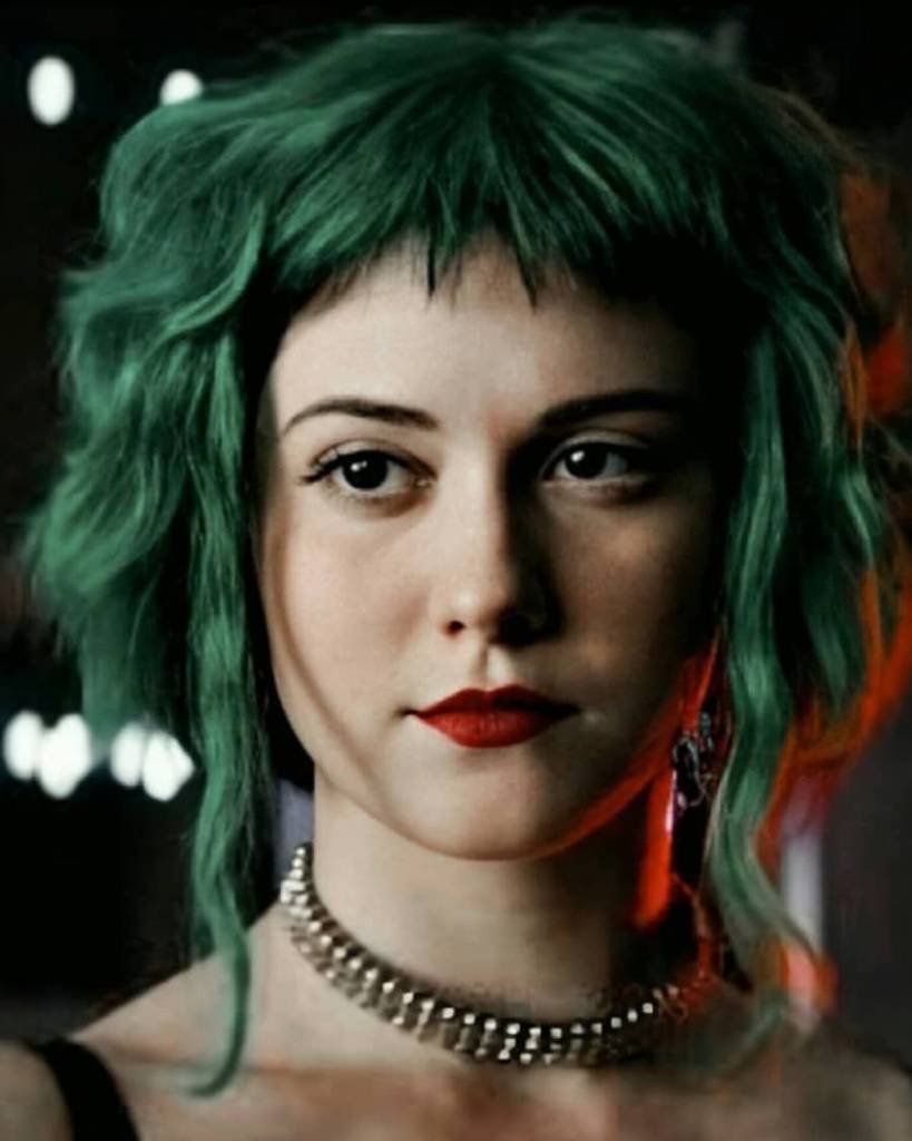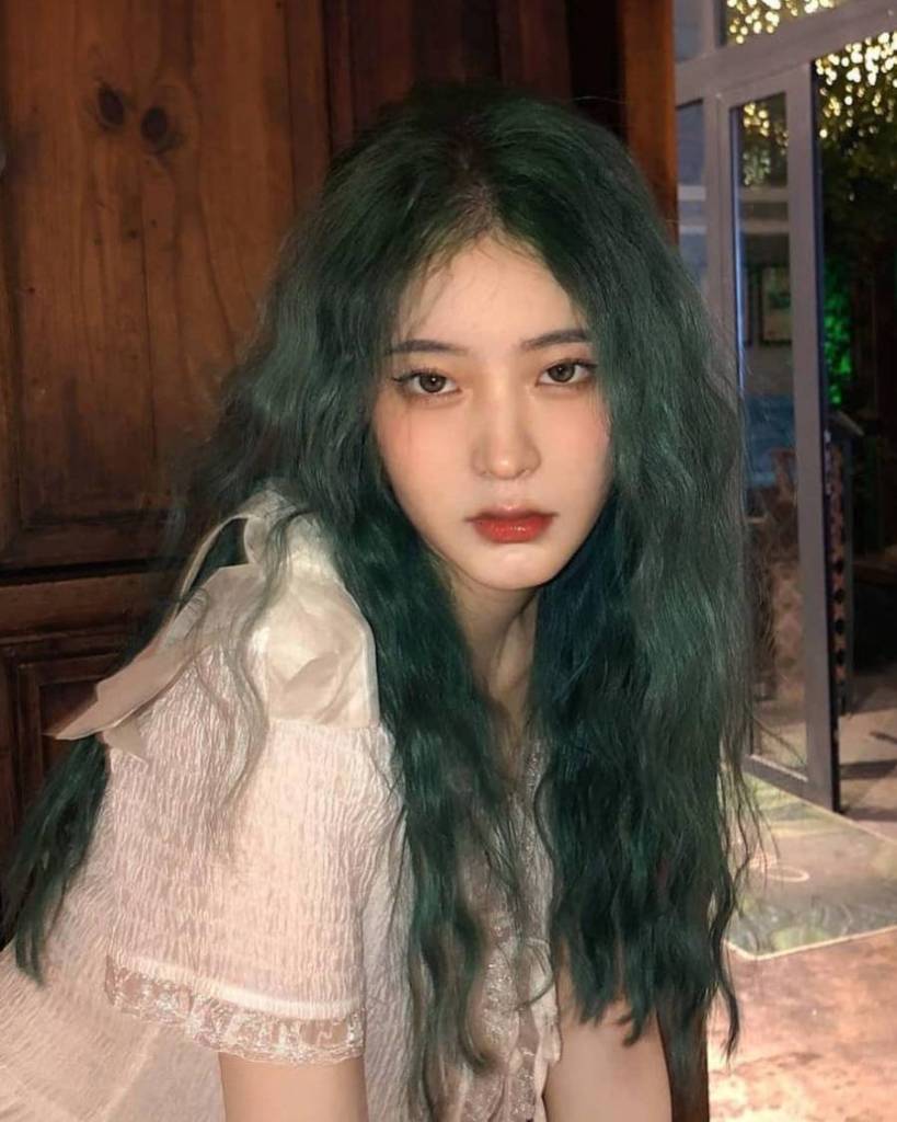 This look is fierce and you can totally tell just by looking at it. We’re talking about dark green hair with blunt bangs, and it’s serving all the attitude. If you want a hairstyle that’s got edge, confidence, and a little bit of mystery, this is the one for you.