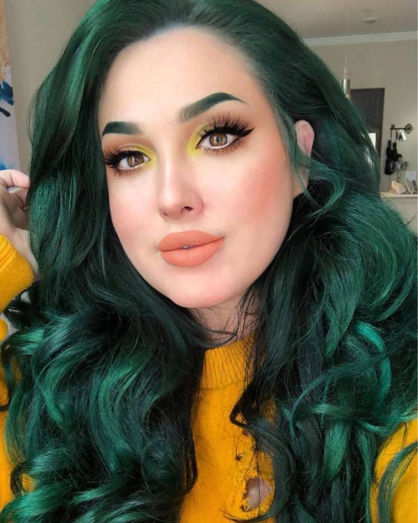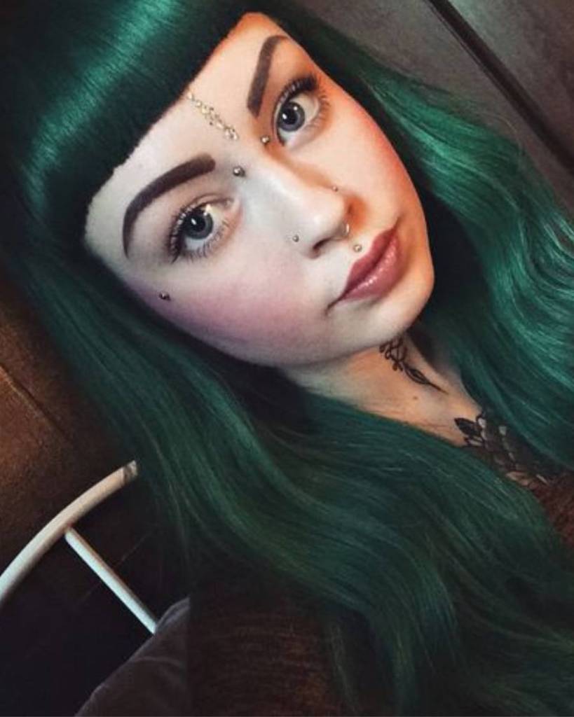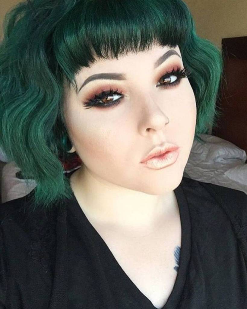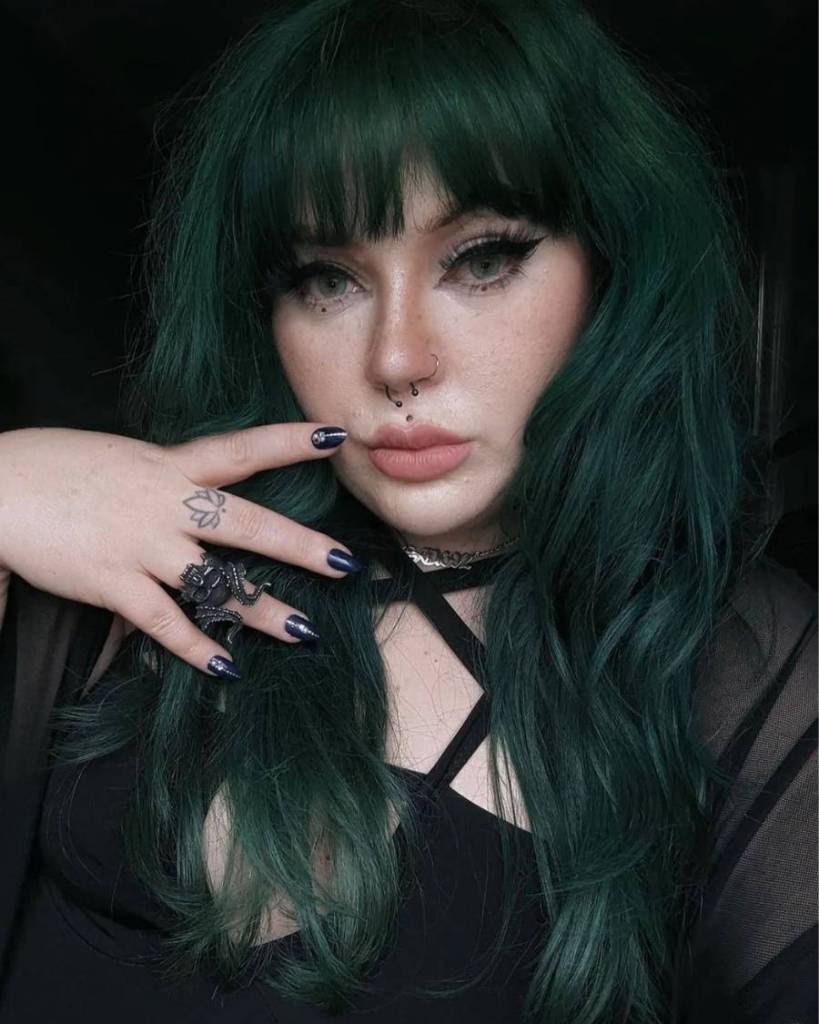 The rich green shade paired with those blunt baby bangs creates a unique hairstyle.