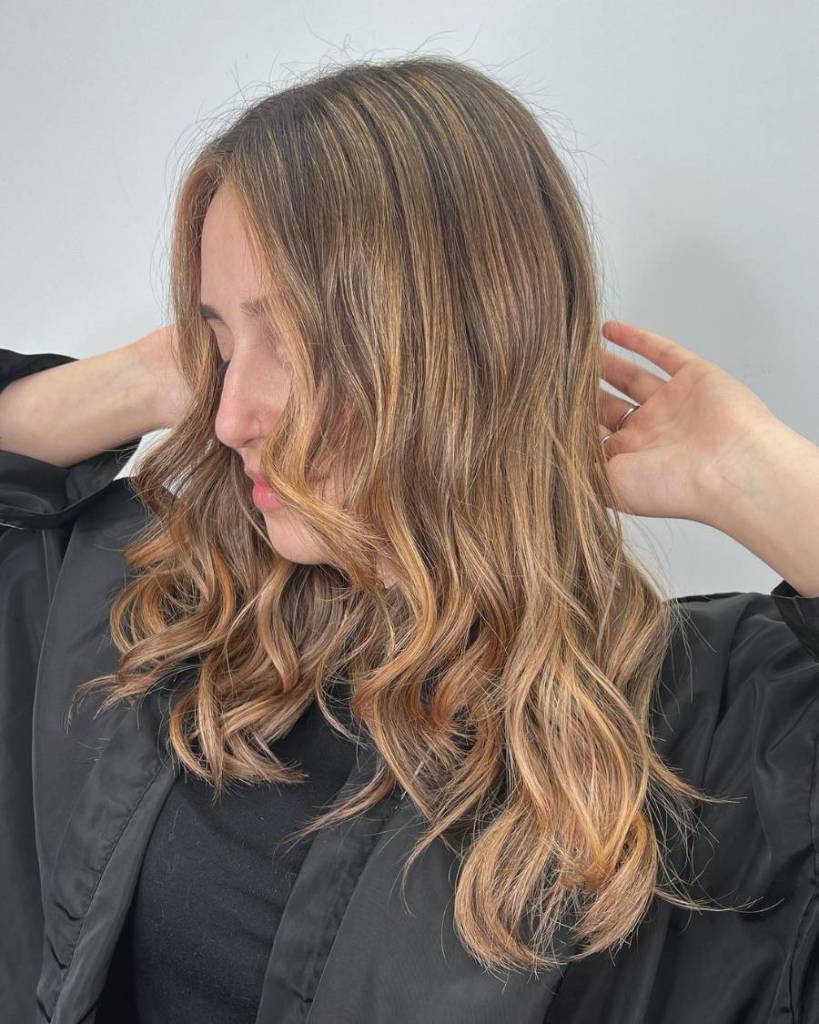 Medium-length wavy hair in honey brown gives you a sun-kissed look with soft layers and gentle waves. This style is all about warmth and light, with the honey brown shade creating a natural, glowing effect.