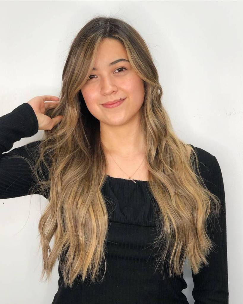 For an ultra-glam look, try long, wavy hair with a middle part. The waves are voluminous and bouncy, and the middle part gives your face a flattering frame. The honey brown color adds a touch of golden glamour, making this hairstyle perfect for any special occasion.