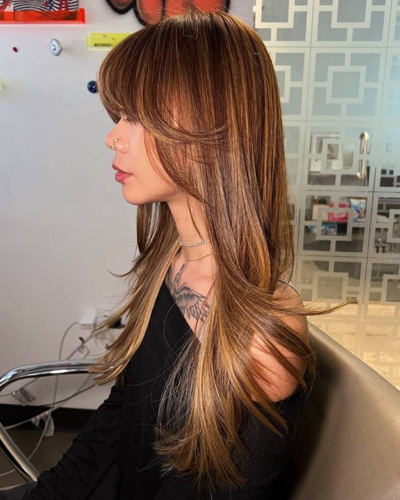 Straight, glossy locks combined with a chic fringe are a classic yet contemporary way to show off your honey brown hair. The fringe frames your face, adding a youthful vibe while the straight, smooth hair emphasizes the richness of the honey brown shade.