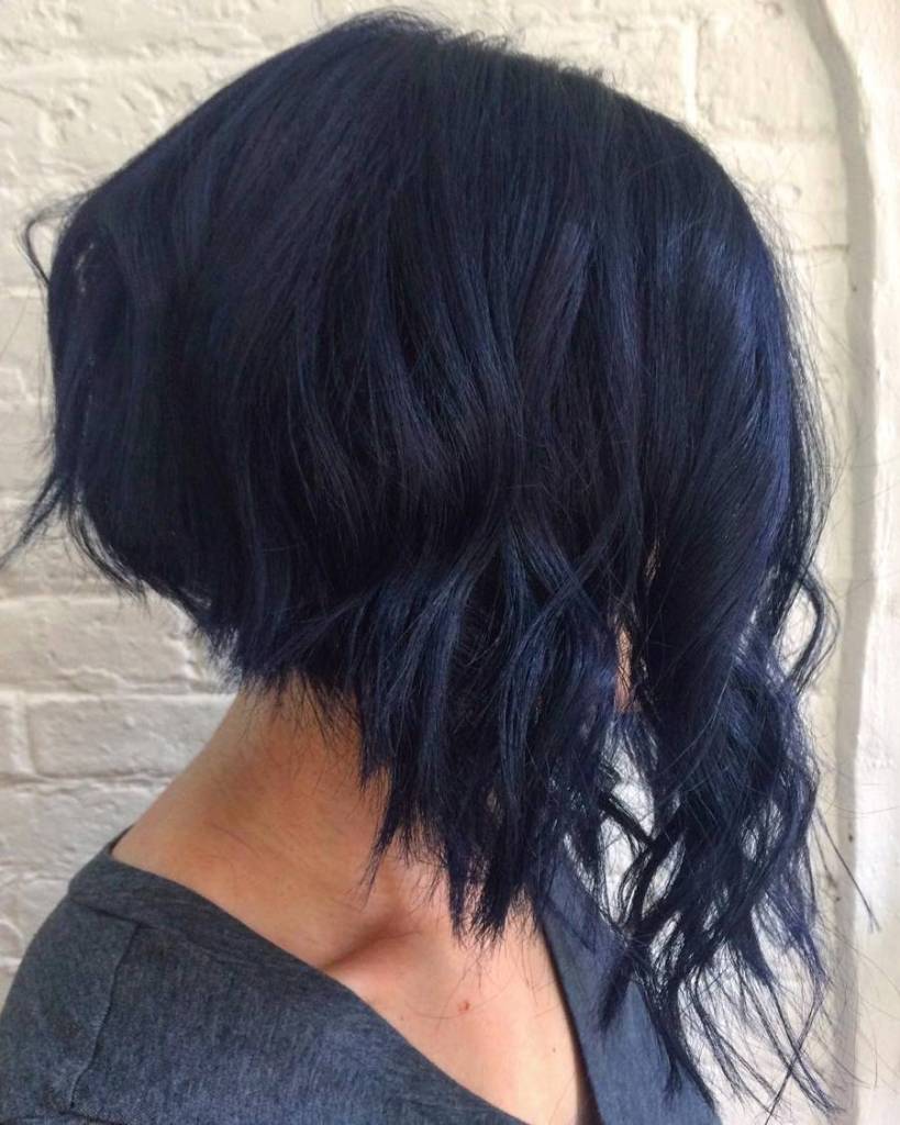 This midnight blue hair with bangs? Totally adorable! Those short bangs really frame your face in such a flattering way, giving off that cool retro vibe but with a fun modern twist.