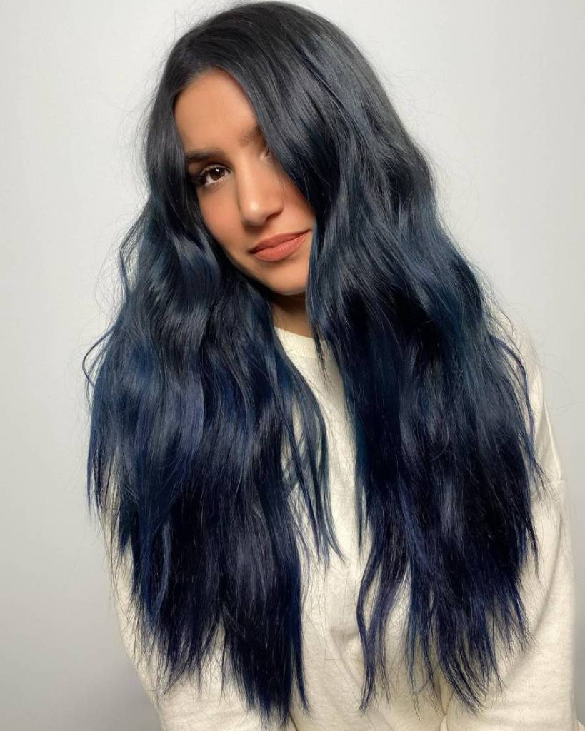 This long, midnight blue hair has that deep, almost-black vibe at the roots that fades into a chill, moody blue as it flows down—totally eye-catching!